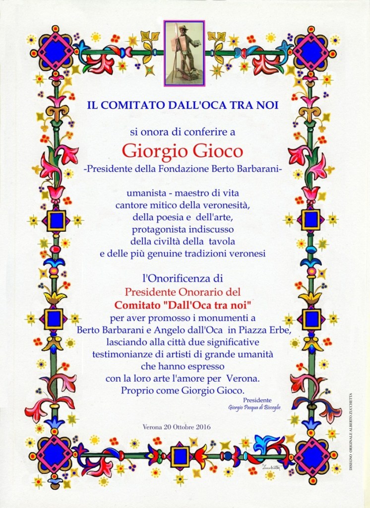 Verona – Si conclude il percorso (iniziato nel 2004 con la posa del monumento a Berto Barbarani, dello scultore Novello Finotti) con il conferimento a Giorgio Gioco presidente della Fondazione Berto Barbarani – protagonista indiscusso della civiltà della tavola e delle più genuine tradizioni culturali veronesi – del titolo di Presidente onorario del Comitato “Dall’Oca tra noi”. Il premio consiste nel primo bronzetto di studio, ideato dal grande artista, Alberto Zucchetta, per la realizzazione del monumento ad Angelo Dall’Oca Bianca, che verrà collocato prossimamente in Piazza Erbe.