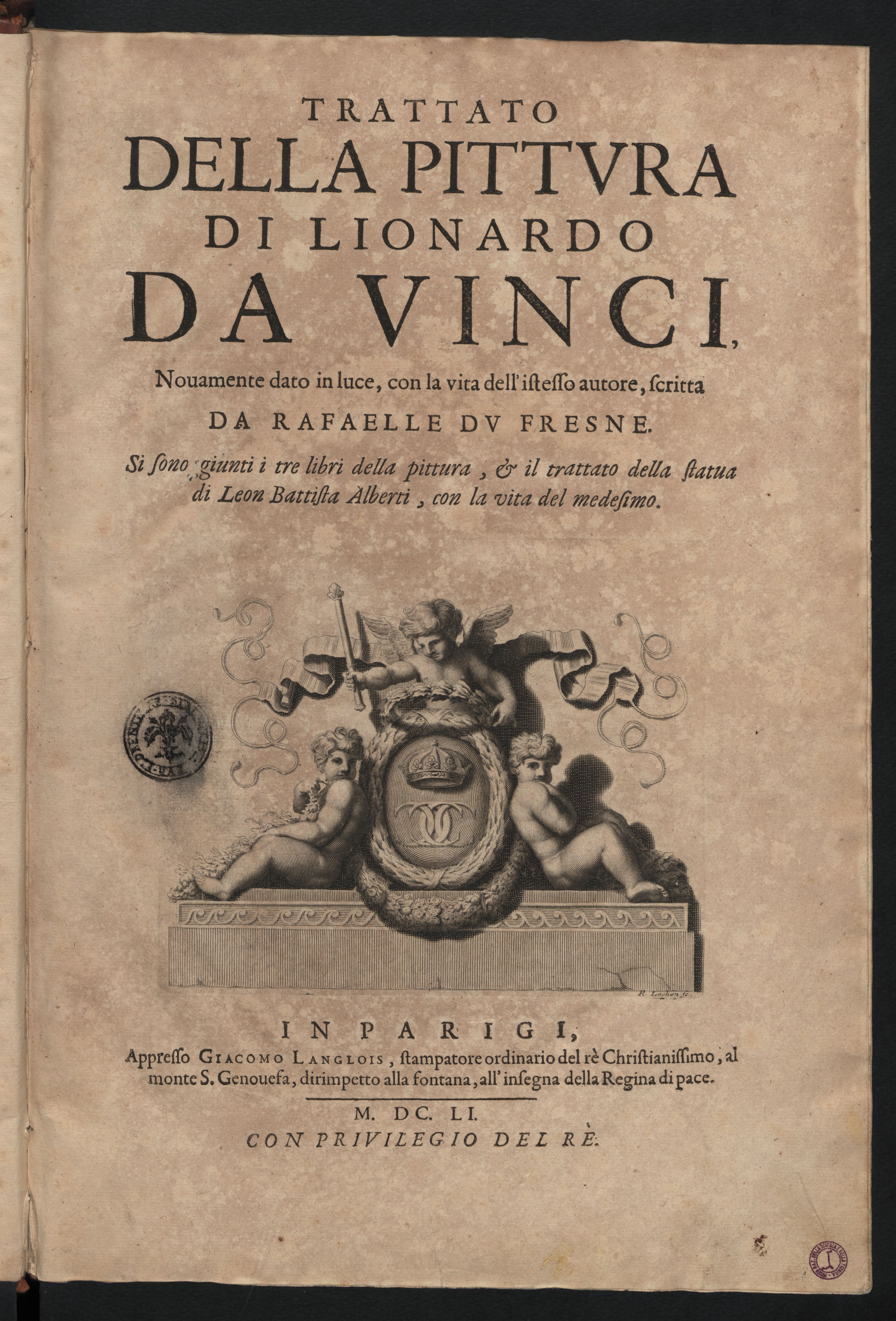 19. a, b, c Leonardo da Vinci, Trattato della pittura di Lionardo da Vinci, novamente dato in luce, con la vita dell’istesso autore, scritta da Rafaelle du Fresne. Si sono giunti i tre libri della pittura & il trattato della sta