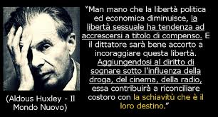 Attenzione perché nel suo Mondo Nuovo il visionario Huxley prospettava anche un nuovo modo per fare figli, in provetta naturalmente programmati e manipolati secondo caste, governatori, amministratori, operai. Tutti funzionali a una società guidata da economia e politica, senza identità, senza sentimenti, senza amore, senza pensiero libero.