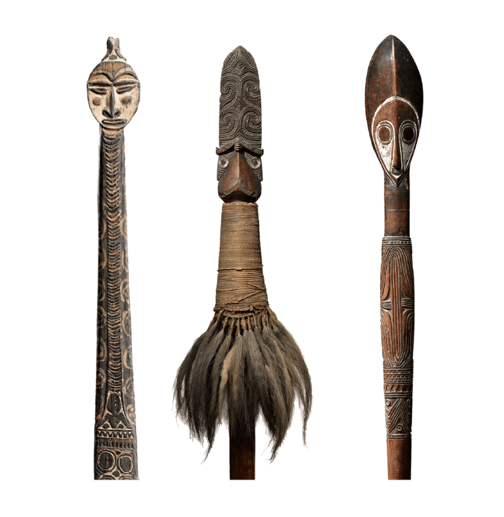 È significativo che molti bastoni realizzati con grande attenzione e materiali pregiati presentino caratteristiche o forme antropomorfe: rappresentazioni di antenati, riferimenti a presenze ancestrali come mezzi per attivare un potere divino e svolgere un ruolo protettivo nei confronti di chi le detiene.