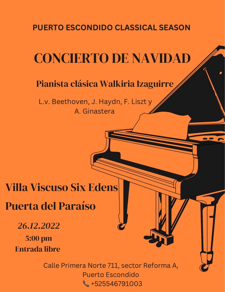 Il 26 dicembre, Santo Stefano a Puerto Escondido nel paradiso di Six Edens dell’artista Emanuele Viscuso, alle ore 17, avrà luogo il concerto di Natale della pianista Walkiria Izaguirre.