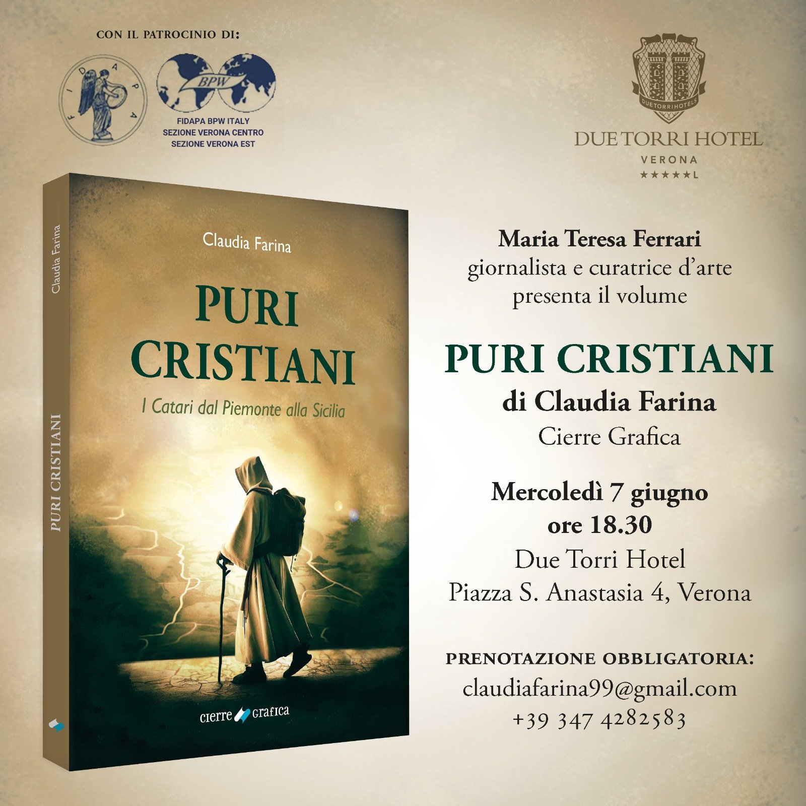 “Puri Cristiani” I Catari dal Piemonte alla Sicilia. Il nuovo libro di Claudia Farina sarà presentato da Maria Teresa Ferrari. Appuntamento il 7 giugno alle 18.30 presso il Due Torri di Verona