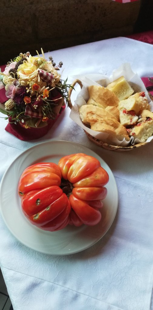 Gabriella Poli – Monzambano – La grandine non lo ha scalfito. Questo gigante ha resistito alla recente sassaiola di ghiaccio che ha distrutto la sua pianta madre. Colore rosso sangue, carnoso e maturo. Verrà sacrificato questa sera in bruschetta con sale olio, origano e aglio.