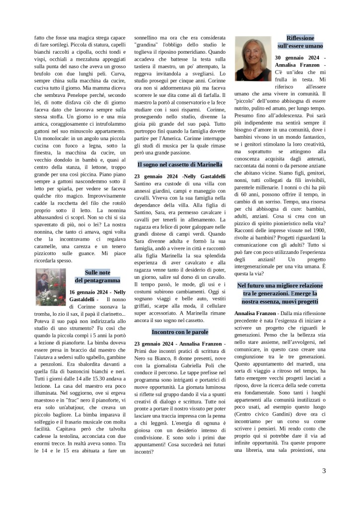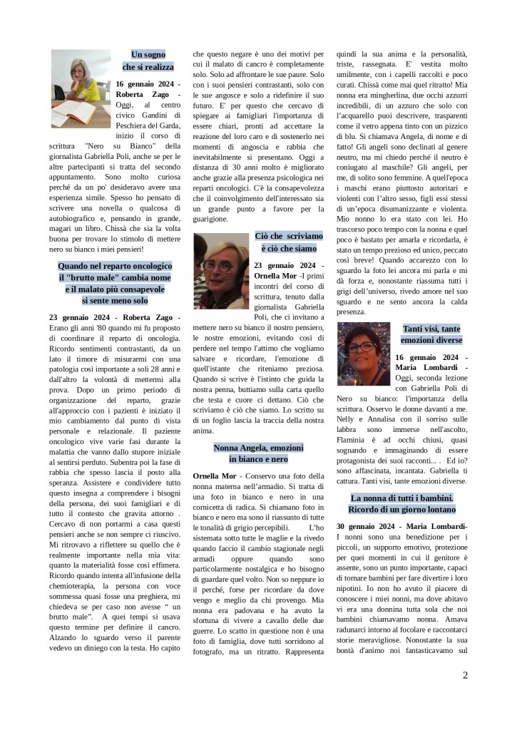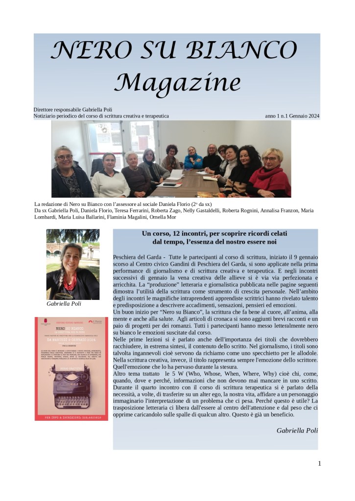 Ecco il primo notiziario del mese di gennaio del corso di scrittura creativa e terapeutica che si svolge al centro civico Gandini di Peschiera del Garda. Vi sono stampati gli articoli dei partecipanti scritti nel mese di gennaio.