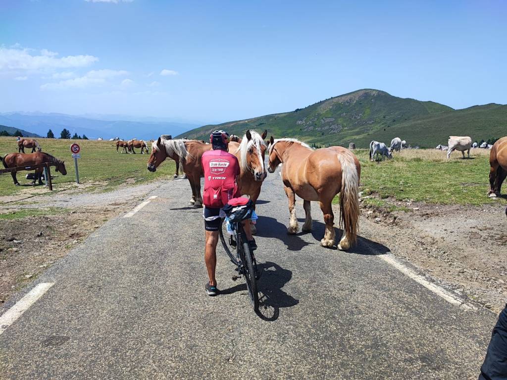 Martin Angioni – 28 luglio 2024 – Pirenei giorno 2 – da Escouloubre ad Auzat appena 90 km con 1.8k d+. Primo colle serio, duro ma bellissimo dei Pirenei, ovviamente percorso dal Tour de France. Un misto di Fauniera e Agnello. Molto caldo nel pomeriggio tanto che abbiamo rinunciato a una parte del percorso, per arrivare più in fretta, e nonostante questo taglio siamo ugualmente “cotti”. Sulla salita e nella discesa del colle Pailheres cavalli in mezzo alla strada, tanto che i tre unici motociclisti incontrati scendevano a spinta, mentre le auto stavano ferme, visto che i cavalli erano immobili nella carreggiata, come dei partigiani di Ultima Generazione. Infatti ho scambiato grandi affettuosità con questi intelligenti quadrupedi. Panorami sempre eccezionali, strade meravigliose, siccome guida Simone, il 99% del tempo non ho la minima idea di dove mi trovo, il che è bellissimo!