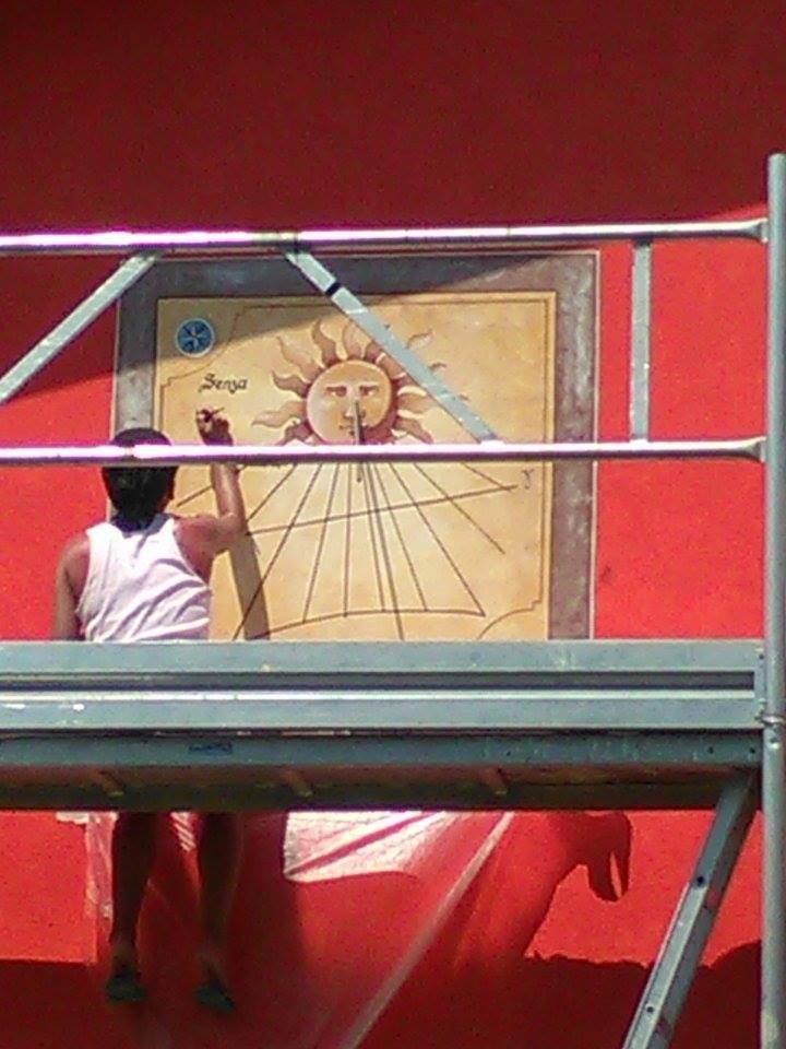 Per trasferire il tutto sul muro, venne chiamata una decoratrice di alta professionalità: la splendida Claudia, magnifica creatura dalla corporatura esile e agile come una gazzella e dalle mani esperte nell’arte del dipinto. L’artista lavorò ore e ore sotto il sole caldissimo. Ad opera ultimata si ottenne un risultato che premiò il decoratore, il progettista e l’ anonimo muro divenne un magnifico murales con una frase: “senza il sole nulla son io“.