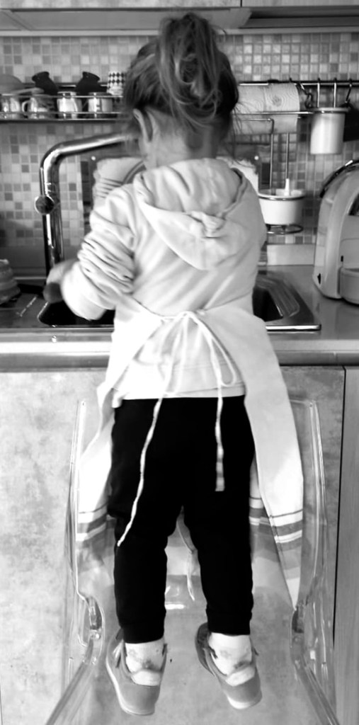 Iniziò la seconda fase più bella della mia vita: avevo 6 anni e indossando un lungo grembiule, mi arrampicavo su uno sgabello posto davanti ad un lavello e mi divertivo con acqua, sapone e spugna a “lavare” i piatti del ristorante (in pratica giocavo con l’acqua).