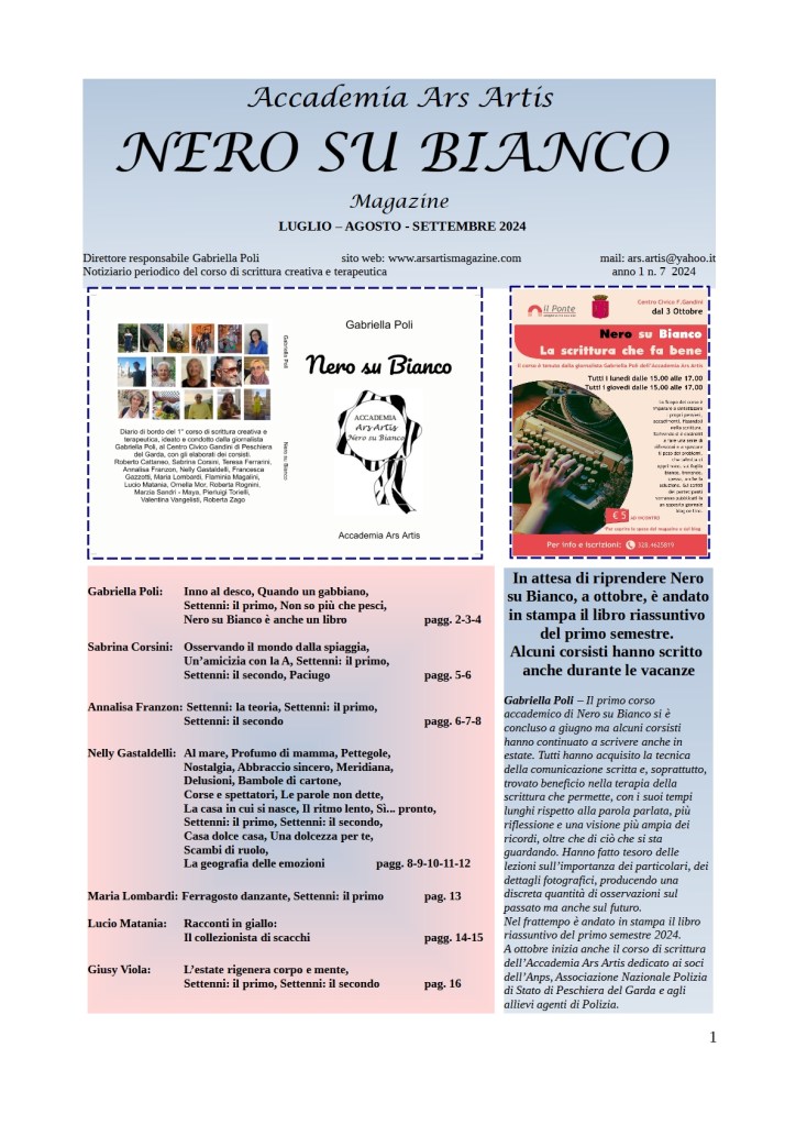 Gabriella Poli – Il notiziario n. 7 raccoglie gli elaborati dei corsisti di Nero su Bianco, di luglio, agosto e settembre. Il primo corso accademico di Nero su Bianco si è concluso a giugno ma alcuni allievi hanno continuato a scrivere anche in estate. Tutti hanno acquisito la tecnica della comunicazione scritta e, soprattutto, trovato beneficio nella terapia della scrittura che permette, con i suoi tempi lunghi rispetto alla parola parlata, più riflessione e una visione più ampia dei ricordi, oltre che di ciò che si sta guardando. Hanno fatto tesoro delle lezioni sull’importanza dei particolari, dei dettagli fotografici, producendo una discreta quantità di osservazioni sul passato ma anche sul futuro.
