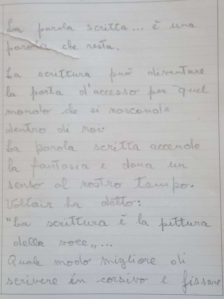 Nelly Gastaldelli – La scrittura può diventare la porta d’accesso per quel mondo che si nasconde dentro di noi. La parola scritta accende la fantasia e dona un senso al nostro tempo. Voltaire ha detto: “La scrittura è la pittura della voce”… Quale modo migliore di scrivere in corsivo e fissare i pensieri per iniziare il nostro dipinto?