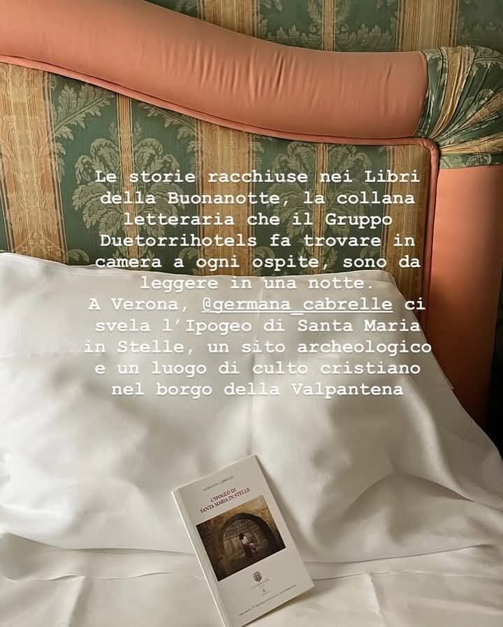 Si chiamano i libri della Buonanotte perché si leggono tutto d’un fiato. Il gruppo Hotel Due Torri di Verona li fa trovare sul comodino dei clienti. Fa parte della collana letteraria anche il libro di Germana Cabrelle ” L’ipogeo di Santa Maria in Stelle” recentemente presentato nella sala conferenze del Due Torri.