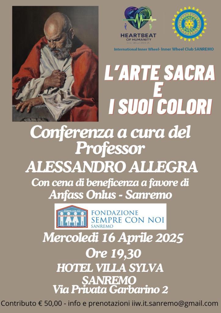 Gabriella Poli – Sanremo – “L’arte sacra e i suoi colori” ha “illuminato” la conferenza del pittore Alessandro Allegra, tra l’altro docente di pittura, all’Accademia di Belle Arti di Sanremo. Il 16 aprile scorso infatti, in un incontro di beneficenza a Sanremo, a favore di “Anfass” e “Fondazione Sempre con noi”, promosso da “Heartbeat of humanity” e “International Inner Wheel” club di Sanremo, il prof. Allegra ha affrontato il tema “come si concepisce un’opera pittorica nella fattispecie in ambito sacro”.