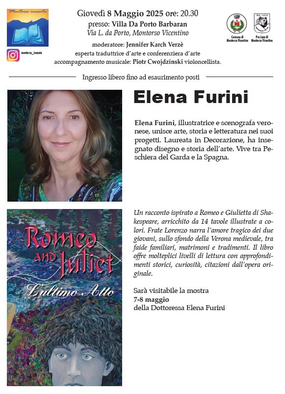La scrittrice Elena Furini, già docente di Disegno e Storia dell’Arte, scenografa ed illustratrice, accompagnata dalle preziose note del maestro Cwojdzinski, dalla voce recitante dell’attrice Daria Anfelli, e intervistata dalla traduttrice e conferenziera d’arte Jennifer Karch Verzé, ha spiegato con dovizia di particolari, il dipanarsi della vicenda, ripresa nel suo libro, sulla tragica storia d’amore tra Giulietta Capuleti e Romeo Montecchi.