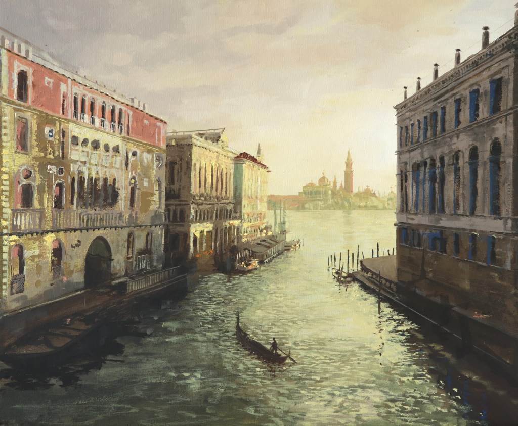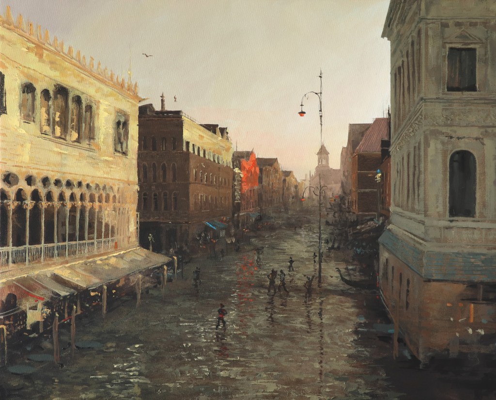 I soggetti in mostra spaziano dal mondo animale – come il toro, simbolo di forza e metafora della natura primitiva – a paesaggi popolati da alberi dalle foglie rosse, segni di resilienza e speranza. Le architetture della serie Aurum, avvolte da un velo dorato, riflettono la vita urbana trasformando la quotidianità in visioni di splendore. In questa esposizione, in particolare, l’artista rende omaggio a Venezia, celebrandone l’unicità, la storia e la bellezza senza tempo.