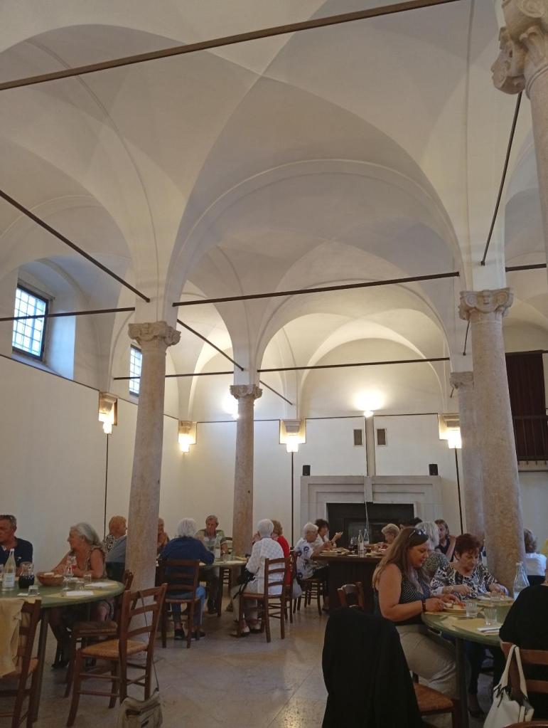Al termine, Alessio Bassi ha voluto passare a fatti concreti invitando i partecipanti a una degustazione presso la “Sala delle Colonne”, location situata in un antico edificio ristrutturato, eretto vicino alla piazza centrale di Ponti sul Mincio, attualmente sede dell’associazione culturale “Il Castello”. Qui vengono organizzate serate culturali, talvolta, appunto, a tema enogastronomico, rivolte alla valorizzazione dei prodotti locali recuperati attraverso antiche ricette medioevali.