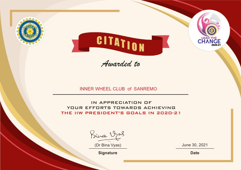 Ho l’onore di essere stata la fondatrice e prima presidente del club e mi piace ricordare questa avventura con le parole che scrissi nel bollettino realizzato in occasione del primo anno sociale 20/21 che riporta tutti i momenti salienti della fondazione, della consegna della charter e dell’attività in quel periodo, oscurato dalle restrizioni governative imposte per la pandemia. Per l’attività la presidente internazionale dell’Inner Wheel inviò anche un riconoscimento per la perseveranza. Ecco di seguito la riflessione da me fatta sul primo bollettino.