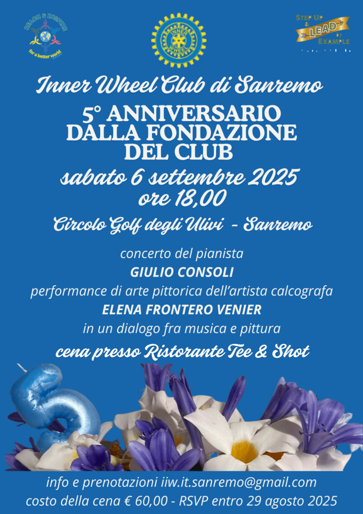 Gabriella Poli – Il 6 settembre prossimo l’Inner Wheel di Sanremo con la sua presidente in carica, Marina Remaggi, festeggia il 5° anniversario della fondazione e della consegna della charter, avvenuta nel settembre 2020, con una cena al Golf degli Ulivi, dove ci fu consegnata ufficialmente cinque anni fa. La cena sarà allietata da un concerto di pianoforte di Giulio Libero Consoli e da una performance pittorica dell’artista calcografa Elena Venier Frontero.