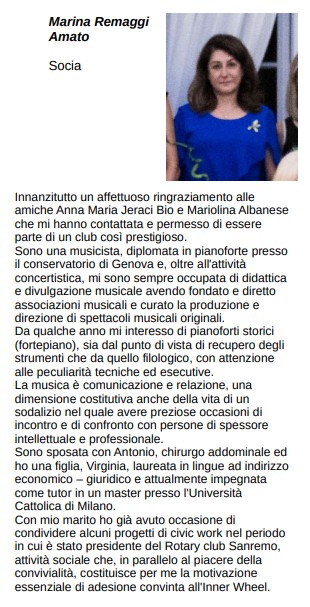 La musica è comunicazione e relazione, una dimensione costitutiva anche della vita di un sodalizio nel quale avere preziose occasioni di incontro e di confronto con persone di spessore intellettuale e professionale. Sono sposata con Antonio, chirurgo addominale ed ho una figlia, Virginia, laureata in lingue ad indirizzo economico – giuridico e attualmente impegnata come tutor in un master presso l’Università Cattolica di Milano. Con mio marito ho già avuto occasione di condividere alcuni progetti di civic work nel periodo in cui è stato presidente del Rotary club Sanremo, attività sociale che, in parallelo al piacere della convivialità, costituisce per me la motivazione essenziale di adesione convinta all’Inner Wheel”.