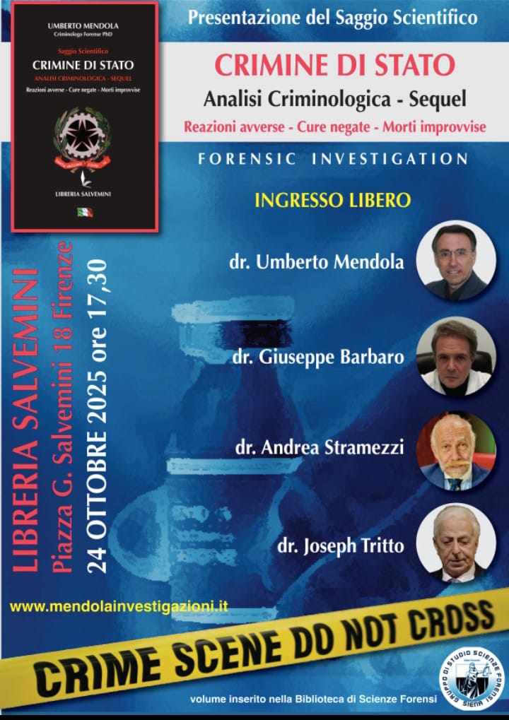 “Crimine di Stato” – è il titolo del saggio scientifico del criminologo forense Umberto Mendola, che con i coautori Giuseppe Barbaro, Andrea Stramezzi e Joseph Tritto, verrà presentato alla libreria Salvemini di Firenze il 24 ottobre prossimo alle 17,30.