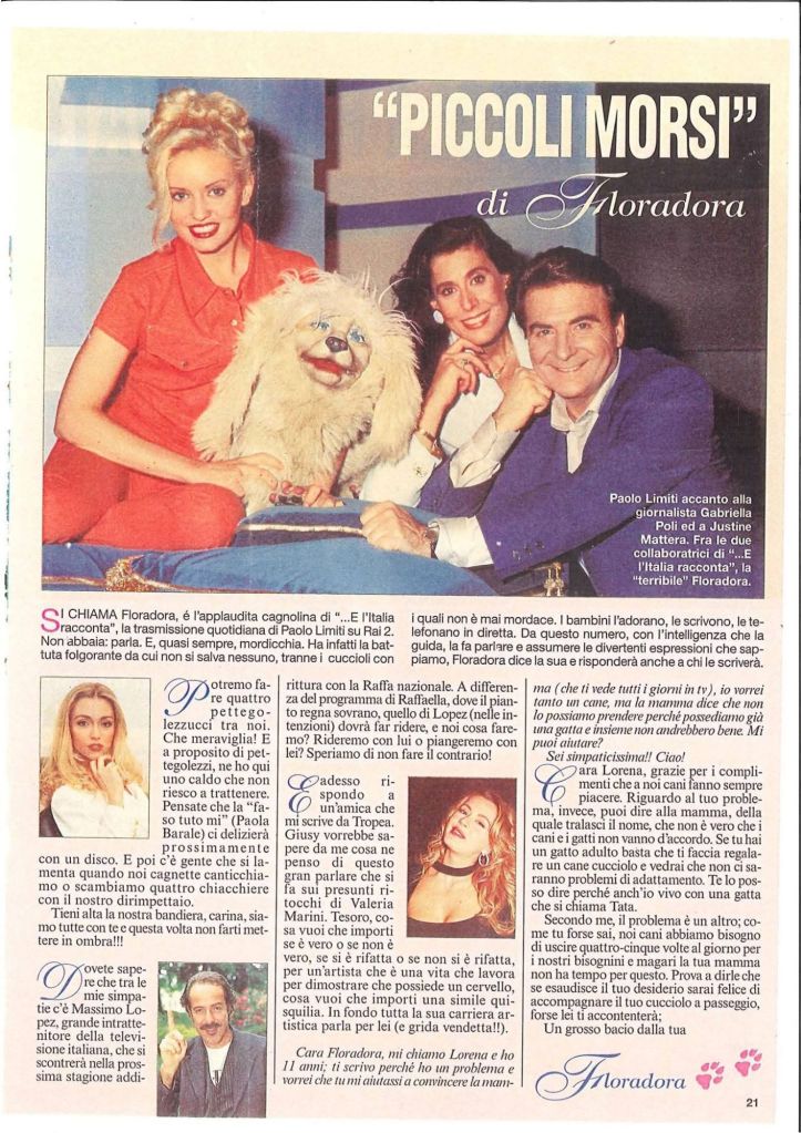 Gabriella Poli – In questi giorni mi sono resa conto che sono passati, meglio volati, circa trent’anni da quando ero in onda su Rai 2, come coautrice e co-conduttrice con Paolo Limiti, tutti i pomeriggi in diretta, nella trasmissione di intrattenimento “E l’Italia racconta”. Io sono quella mora naturalmente. Sovrastavo Paolo di una spanna in altezza, ed ero senza tacchi! Quanto a Justine Mattera, anche lei al suo debutto come sosia di Marilyn Monroe, invece il divario era di due spanne. Questo non perchè la statura fisica conti. Ma è una curiosità. All’interno del “contenitore televisivo” c’erano diverse rubriche e un simpaticissimo cane di peluche, Floradora, alla quale dava vita un amico di Paolo, Antonio Crapanzano. Floradora teneva anche una rubrica su un settimanale cartaceo “Piccoli morsi”, era impertinente e bizzosa e importunava chiunque partecipasse alla trasmissione. Era così realistica che a volte, a Milano, mi fermavano per strada chiedendo di lei: “Come sta Floradora, è bravissima e simpatica e poi parla…”. “Come parla” – rispondevo – “è un peluche, un cane di pezza”. Vedevo delusione negli occhi di chi mi interpellava. Allora stavo al gioco nella versione del cane parlante… . Ma non era l’unica curiosità della trasmissione. C’era anche una rubrica di ecologia in cucina, allora era una vera novità, e la mia rubrica del “Difensore civico”, una sorta di Forum ante litteram. Come consulente uno studio legale famoso. Gli spettatori inviavano quesiti su qualsiasi questione, eredità, beghe condominiali… lo studio legale mi faceva una traccia di risposta e a me non restava che tradurre il “legalese” in un linguaggio corrente. Tra gli altri autori della trasmissione c’erano Paolo Martini e Paolo Pivetti, padre della futura presidente della Camera, Irene Pivetti.
