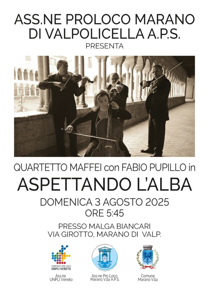 Laura Tessari – Aspettando l’alba, ore 5.30, alla Malga Biancari per il tradizionale concerto della prima domenica d’agosto del quartetto Maffei. Immersi nel verde, aria pulita e fresca, si ammirano le stelle in attesa che inizi la musica. Il Quartetto non delude mai e allieta il pubblico per un’ora e mezza. Esce uno spiraglio di luce. Dopo due bis termina il concerto organizzato, da una decina di anni, dalla Pro Loco Marano di Valpolicella.