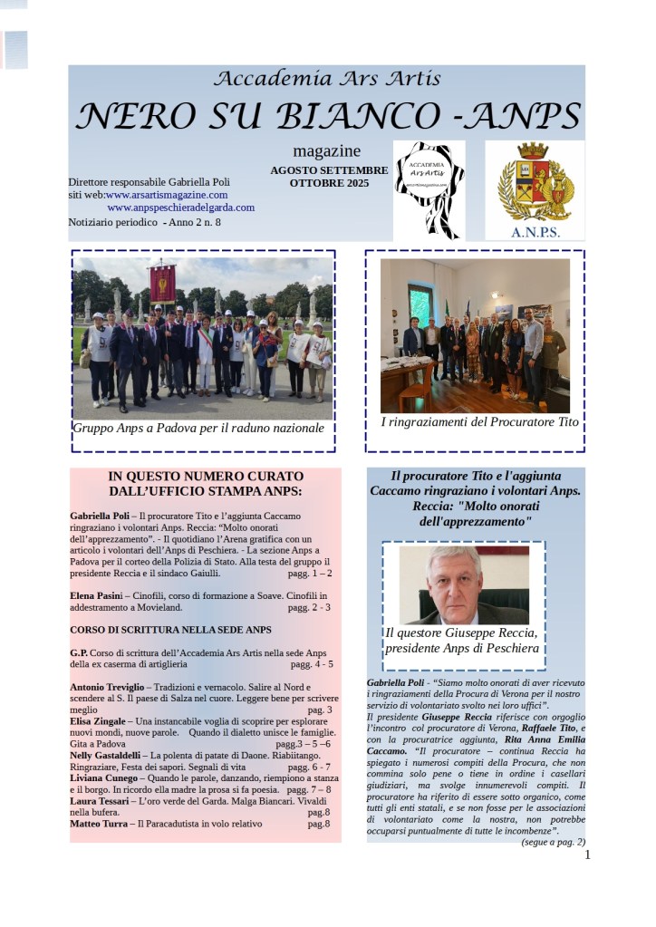 Il notiziario n. 8 dell’Accademia Ars Artis comprende sia gli articoli del corso di scrittura creativa dei nuovi allievi che quelli dell’attività dell’Anps che ospita il corso nella sua sede dell’ex caserma di artiglieria di Peschiera del Garda.
