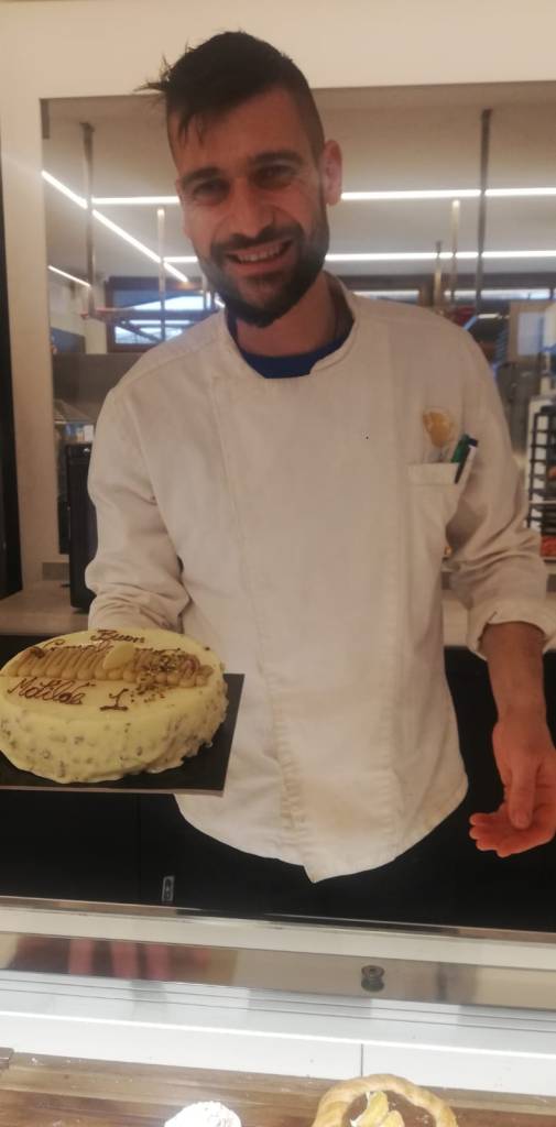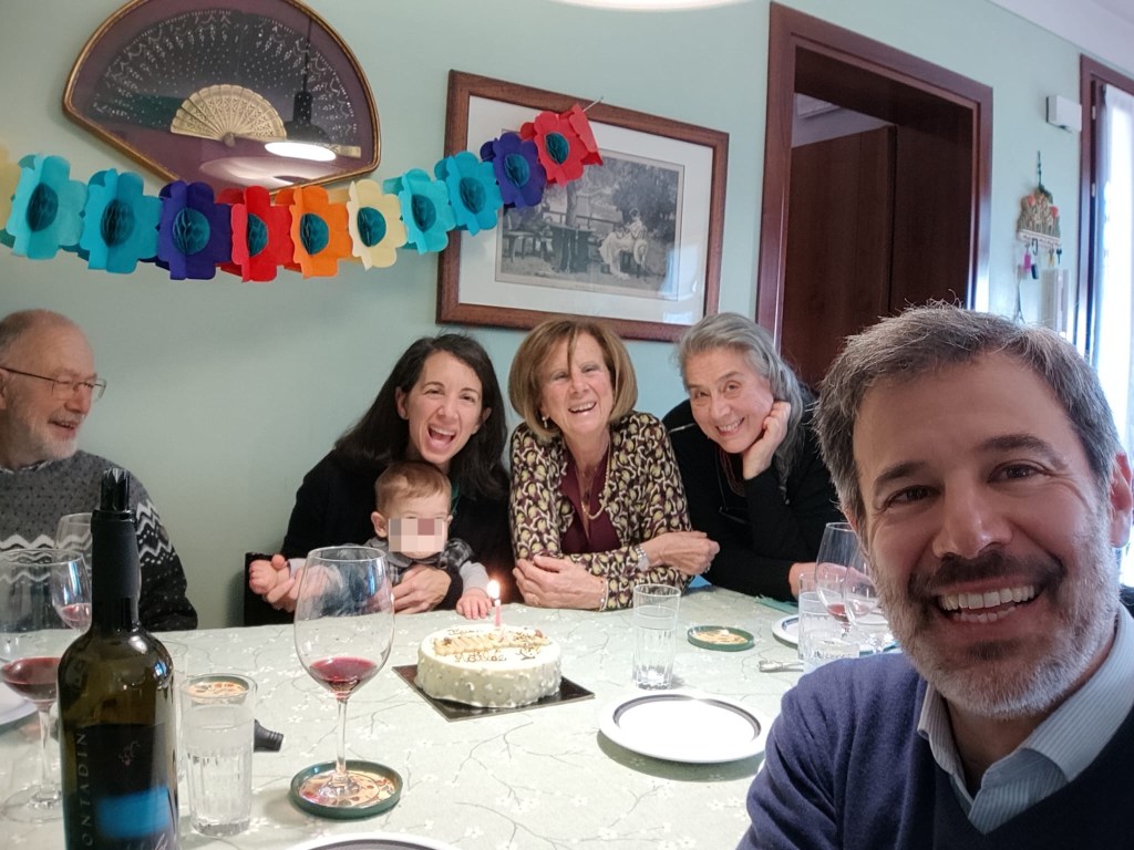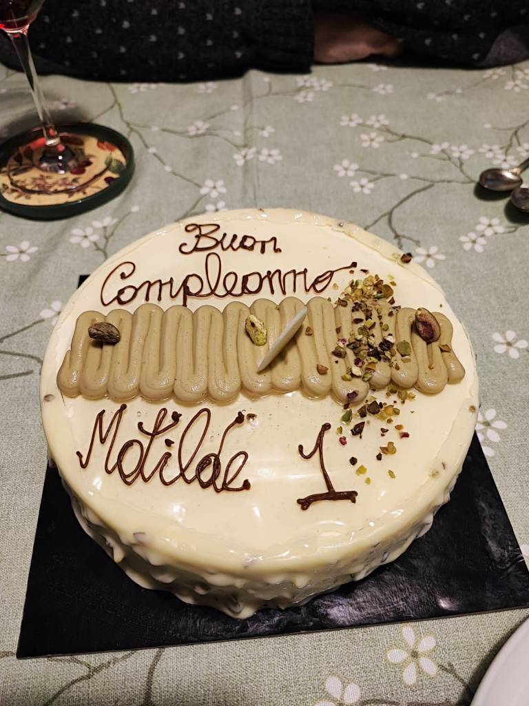A tempo debito piagnucolo. E’ ora di entrare in casa e vedere striscioni augurali ovunque, tappeti pachwork, cuciti da nonna Stocco, in terra così posso gattonare sul pulito, un golfino fatto a mano con degli orsetti, una scatola di legno con giochi musicali. Cosa? Si suona? Tamburello, buono per la tarantella, un piffero che fischia sempre la stessa nota, un cilindro con perline che, girato sotto sopra, simula la pioggia, maniglie con sonagli, simili a quelle dei mariachi, uno xilofono con bacchetta che non so utilizzare ma sul quale si può battere forte quando mi arrabbio e altre amenità. Però sono felice, quando a tavola tutti suonano i miei strumenti per festeggiarmi e spengono per me la candelina n.1 e quelle col mio nome sopra. Quando è l’ora della torta ne spunta una di biscotti di nonna Carla che, con i miei due denti posso “mangiare”, e quella al pistacchio di nonna Poli che si affretta a dire compiaciuta “è firmata dal pasticcere stellato Giorgio Verdoliva della pasticceria “La torta della nonna” di Peschiera del Garda”.