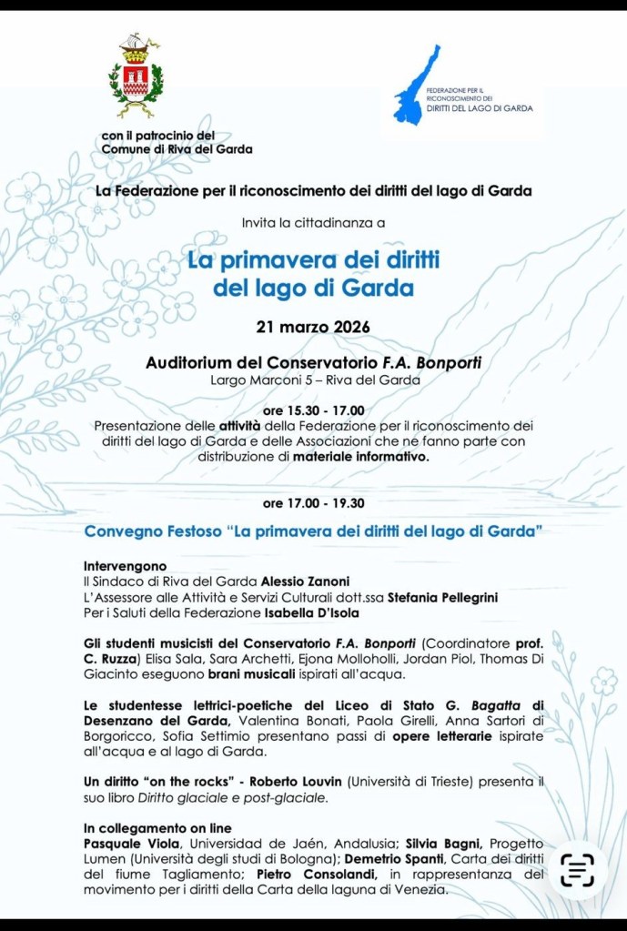 Sabato 21 marzo – Riva del Garda, Auditorium del Conservatorio F.A. Bonporti – organizzato dalla Federazione per il riconoscimento dei diritti del lago di Garda – riguarda il Garda e il suo ambiente: “La primavera dei diritti del lago di Garda”, ore 15.30 – 17 e 17 – 19.30.