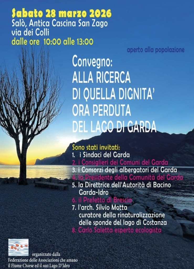 Sabato 28 marzo – Salò – Antica Cascina San Zago, organizzato dalla Federazione delle Associazioni che amano il fiume Chiese e il lago d’Idro – il Convegno “Alla ricerca di quella dignità, ora perduta, del lago di Garda.