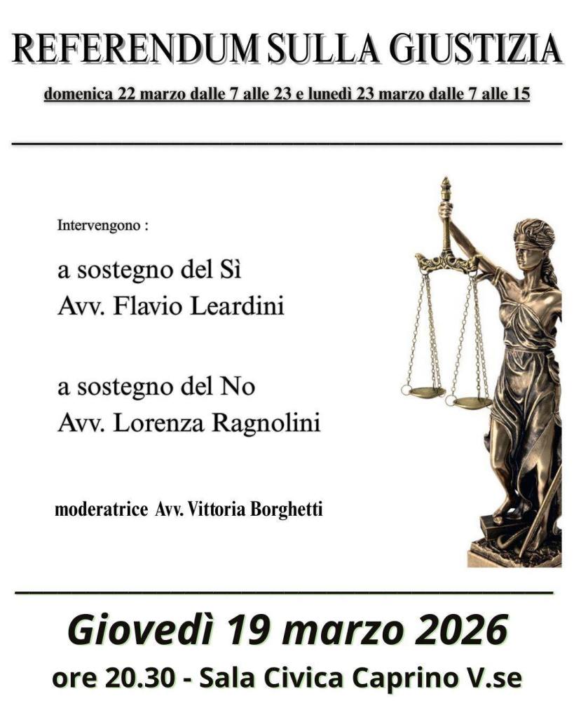 Giovedì 19 marzo – ore 20.30 – sala civica di Caprino Veronese – un appuntamento che riguarda il confronto referendario. Due i relatori: per il Sì, l’avvocato Flavio Leardini; per il No, l’avvocato Lorenza Ragnolini. Moderatrice l’avvocato Vittoria Borghetti