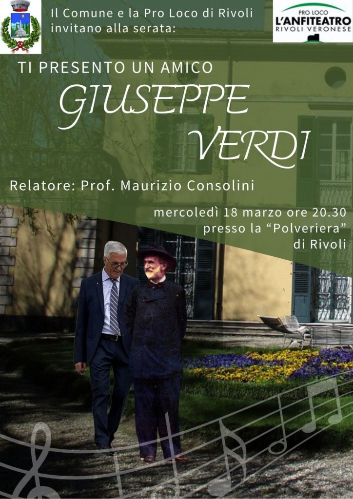 Mercoledì 18 marzo – ore 20.30 – Polveriera di Rivoli Veronese – organizzato dalla Pro Loco L’Anfiteatro di Rivoli Veronese: “Ti presento un amico, Giuseppe Verdi” relatore il prof. Maurizio Consolini
